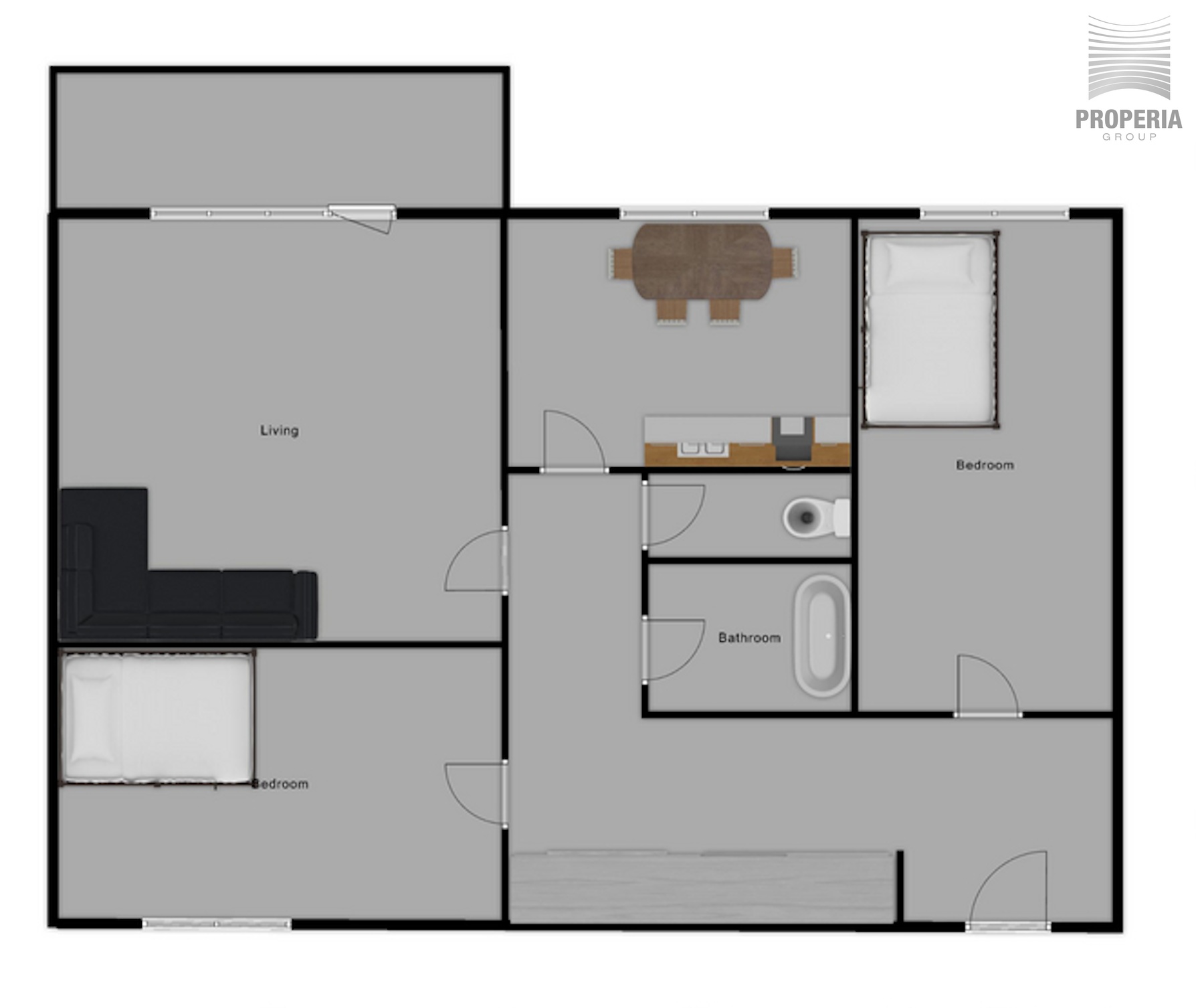 Velikosti místností jsou: Kuchyň 9,83m2, pokoj 12,65m2, pokoj 19,65m2, ložnice 12,08m2, koupelna 2,85m2, WC 1,03m2, předsíň 13,04 m2, spíž 0,45m2, sklep 1,50m2, balkon 5m2
