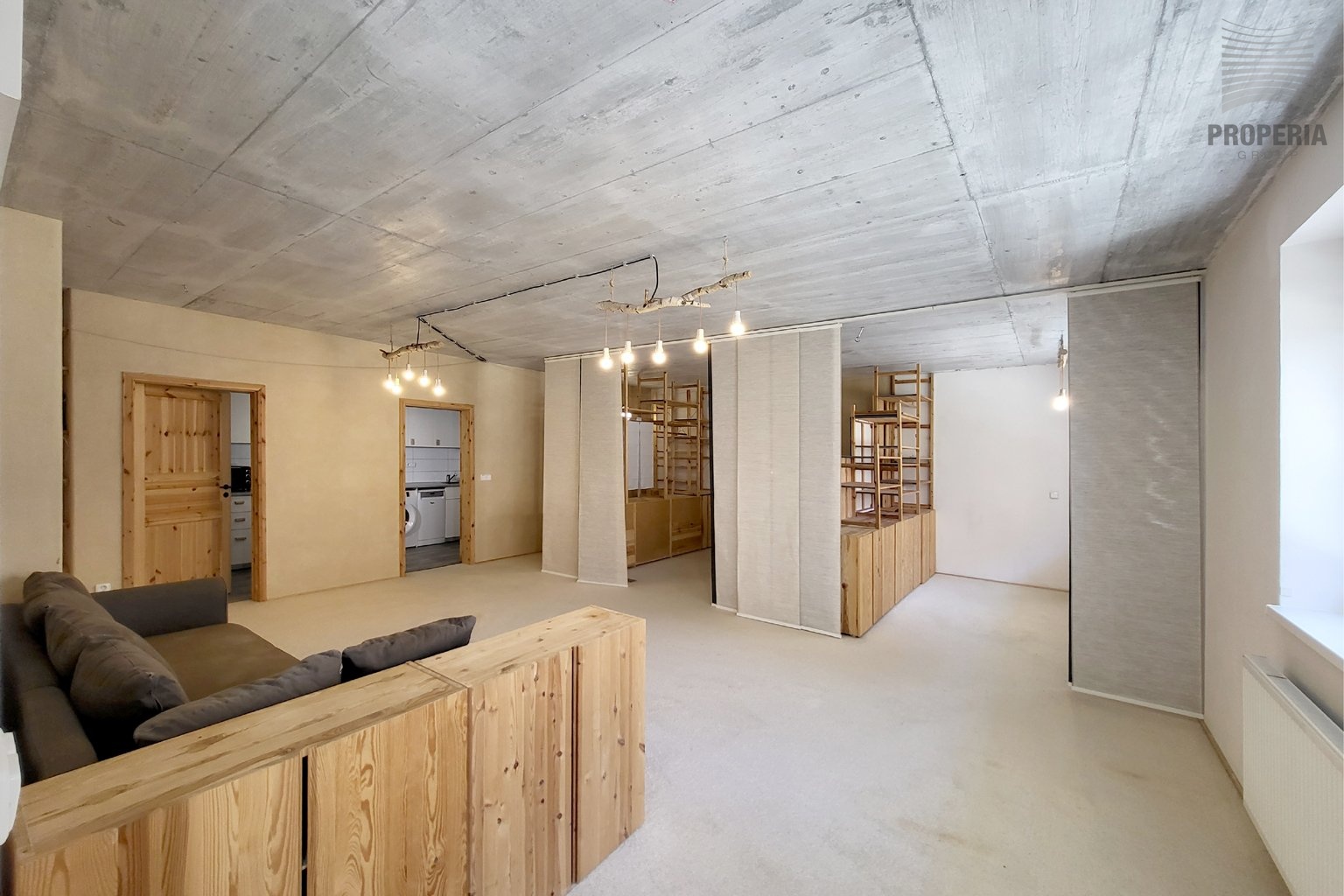Dispozice nabízí nepřeberné možnosti individuálního dělení prostoru dle vašich potřeb. Součástí je kuchyňská linka včetně spotřebičů a další vybavení dle fotodokumentace. Koupelna je vybavena sprchovým koutem a oddělenou toaletou. Prostor pro spaní a pracovnu je modulárně částečně oddělený. Na zdech jsou speciální hliněné omítky, které přispívají k příjemnému klimatu v interiéru. Orientace na východ zajišťuje dostatek denního světla.