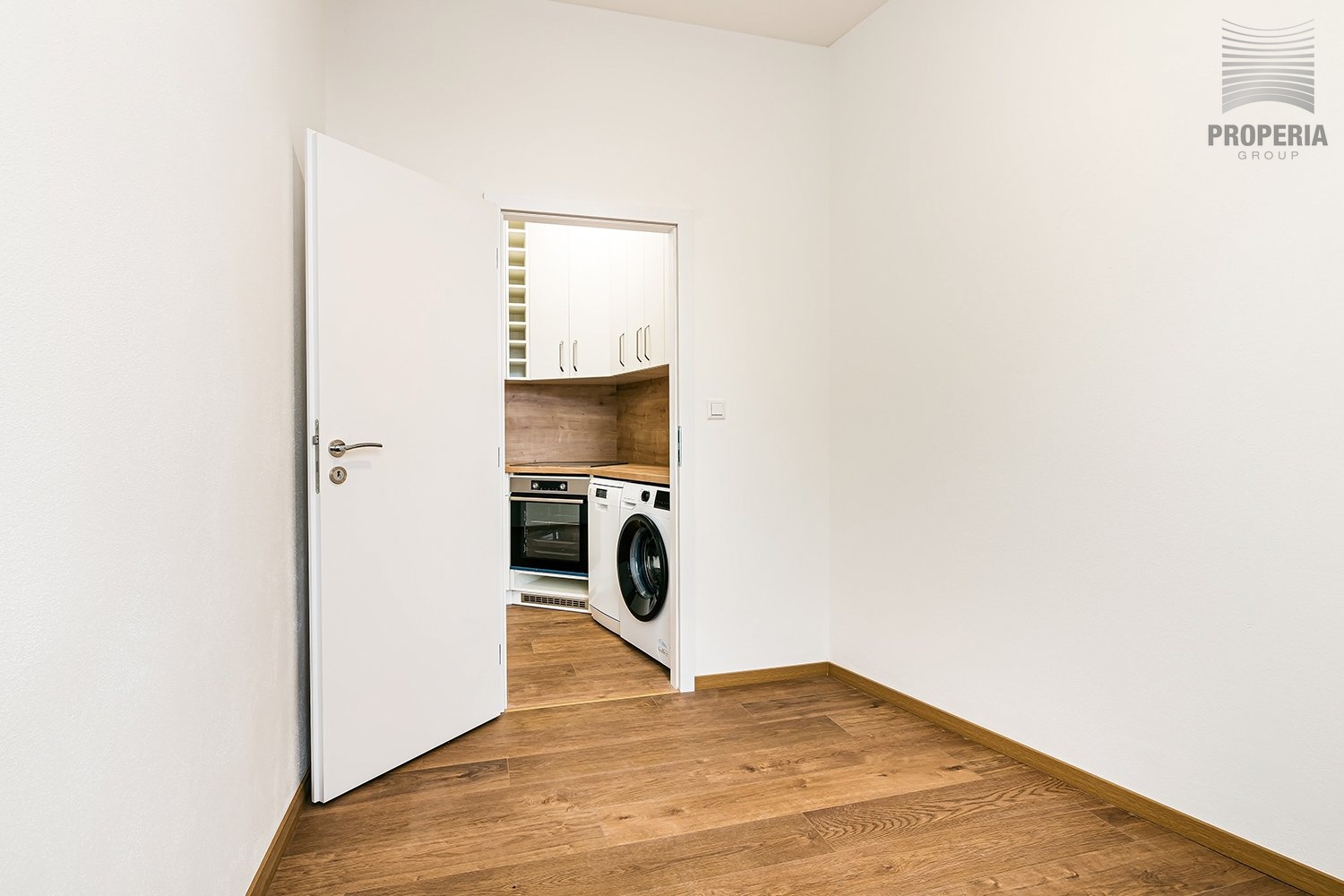 Při vstupu do bytu se ocitneme v prostorné předsíni, ze které vede vstup do jednotlivých místností. Kuchyň je vybavena linkou s vestavnými spotřebiči (varná deska, trouba, myčka, pračka, lednice, digestoř). Koupelna a WC jsou společné, umístěné u vchodu do bytu. Obývací pokoj je zařízen sedací soupravou, konferenčním stolkem a komodou. Ložnice je bez zařízení. K bytu náleží sklep.