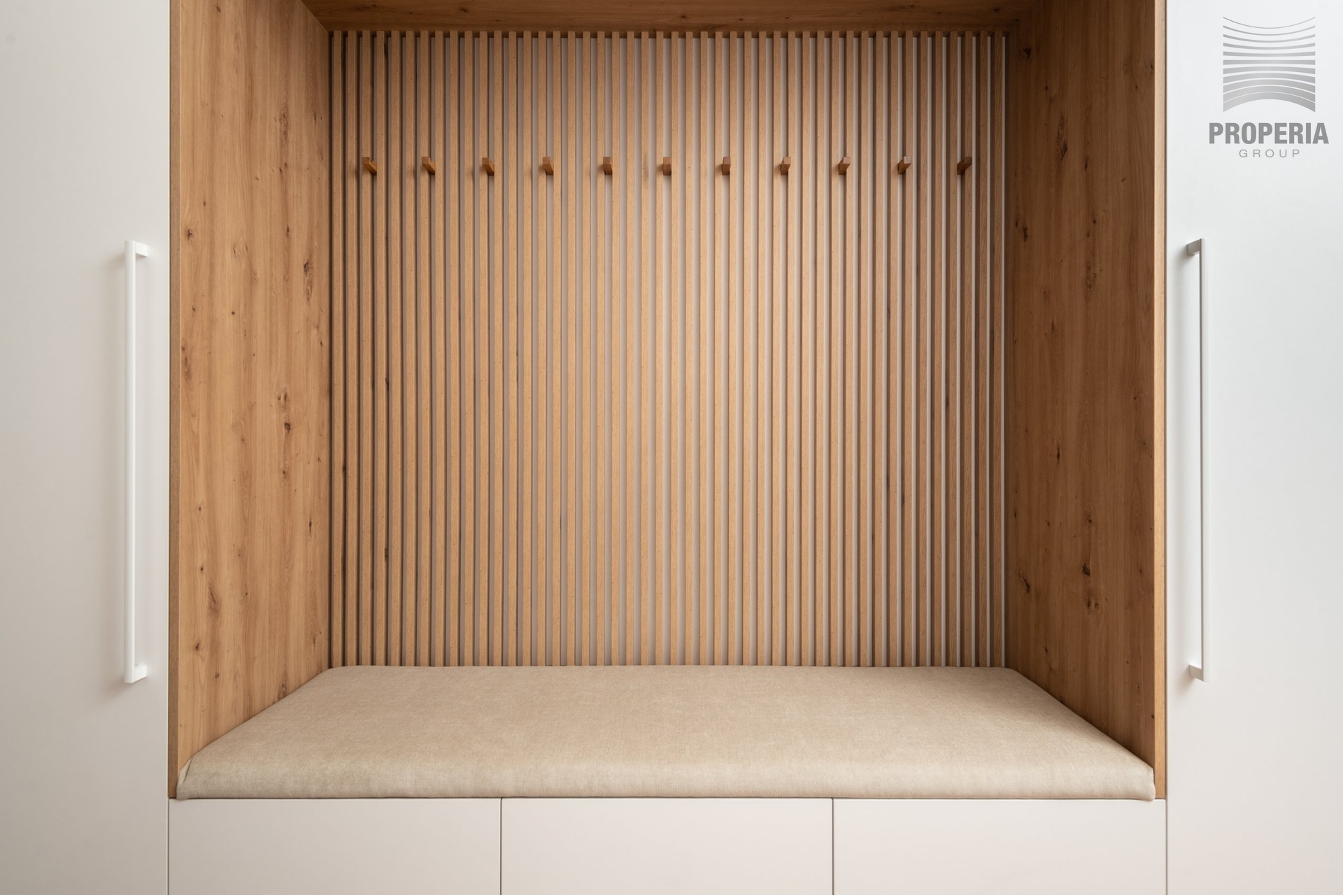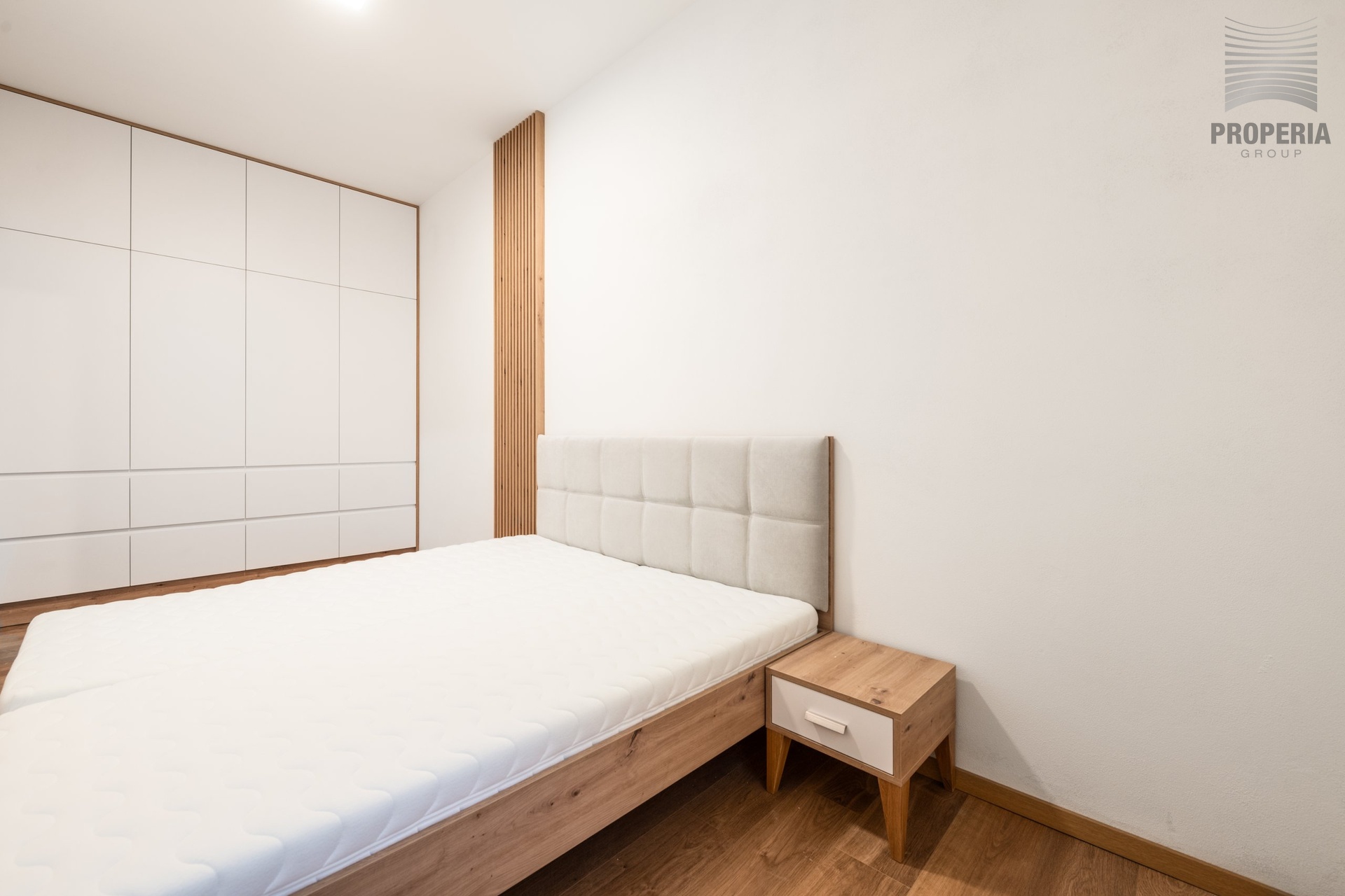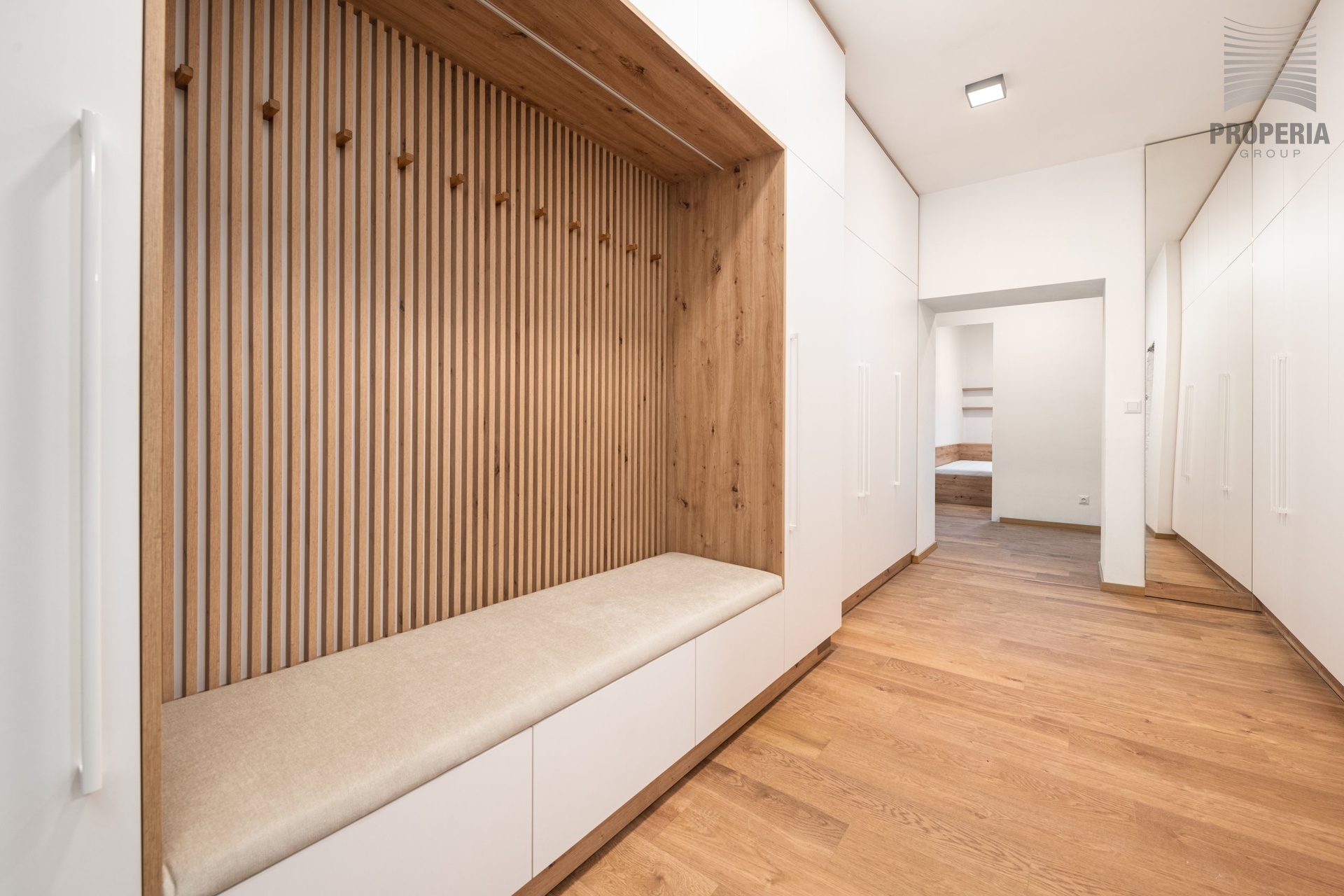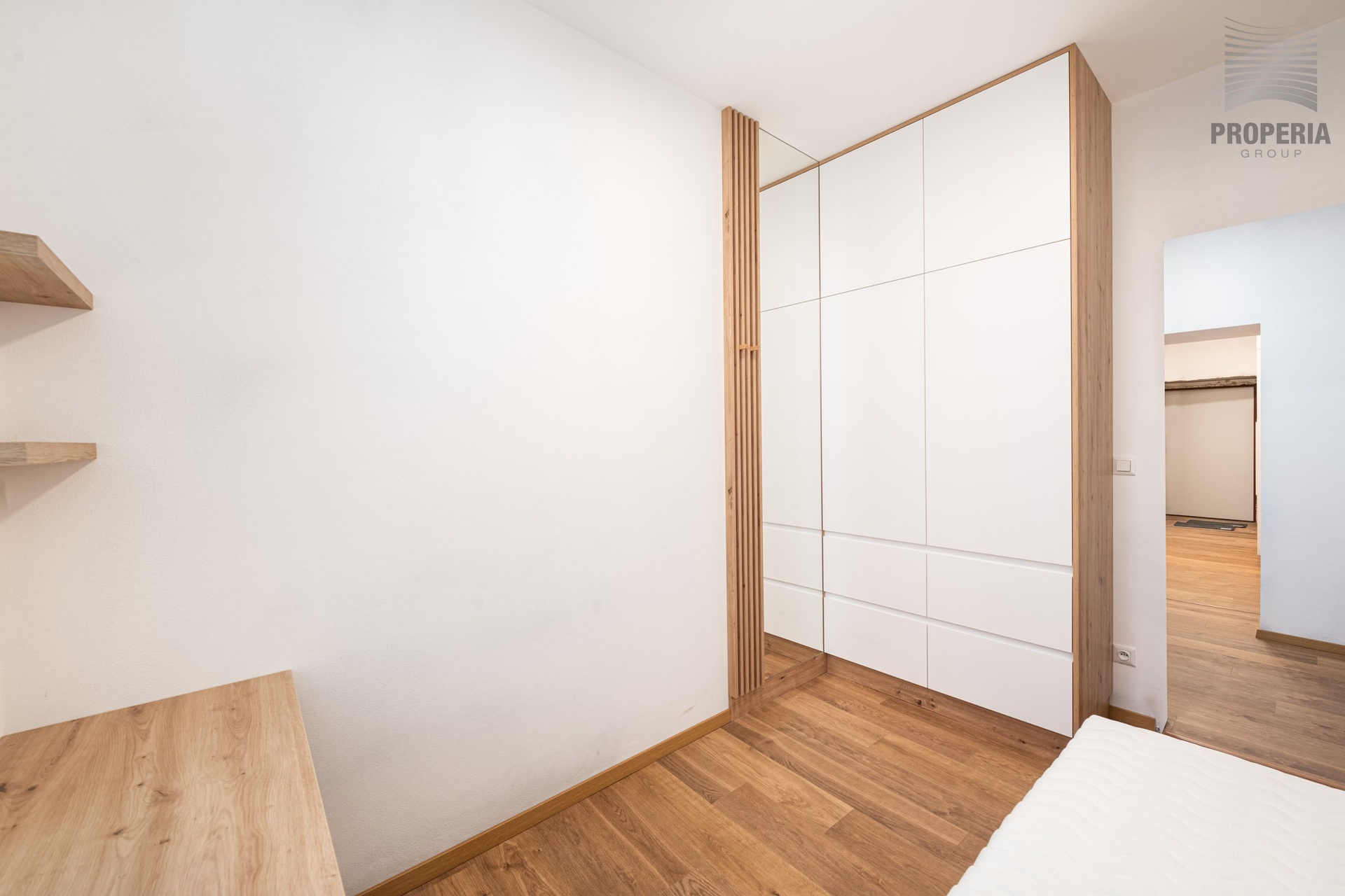 Při vstupu do bytu se ocitneme v prostorné předsíni, ze které vede vstup do jednotlivých místností. V předsíni se nachází velká vestavná skříň. Kuchyň je vybavena linkou s vestavnými spotřebiči (varná deska, trouba, myčka, lednice, digestoř). Ložnice je zařízena manželskou postelí s matrací a vestavnou skříní. Další pokoj je zařízen postelí s matrací, stolem a vestavnou skříní. Koupelna a WC jsou společné, umístěné u vchodu do bytu. K bytu náleží sklep.